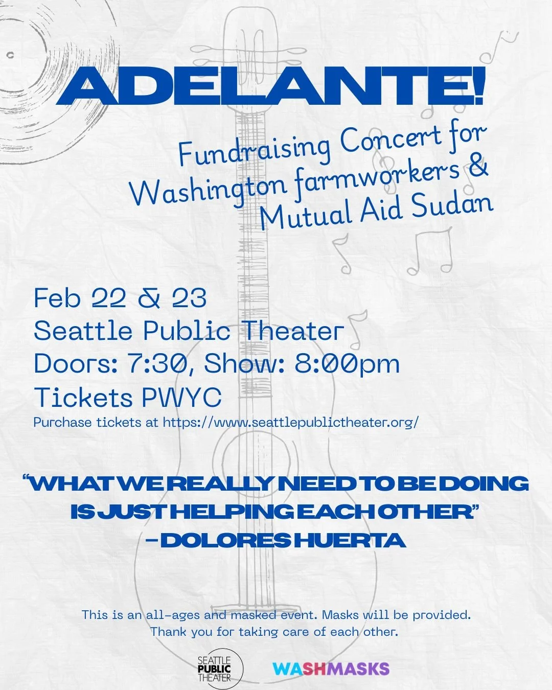 Celebrate music and community care this February 22 & 23 with Seattle Public and WashMasks Mutual Aid’s ADELANTE! Fundraising Concerts. These PWYC concerts are raising funds for Mutual Aid Sudan and Washington farmworkers impacted by December floods. Featuring local Seattle artists like Malex Reed and DJ Siempre Bruja, these will be evenings full of art and dancing.